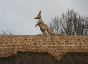 Here is a fine example of a thatched kangaroo this time on a roof in Suffolk and the work of Clive Dodson, Master Thatcher of Cambridgeshire. It is very close to a thatched address we sweep at in West Wickham. There is another Thatched Kangaroo on a roof in this country, this one being on the roof of a tearoom in Godshill on the Isle of Wight. It actually caused quite a stir when it first went up. Under the BBC headline ‘Kangaroo told to hop off’, it was reported that the owner of the Royal Essex Cottage restaurant and tea room was having to apply for planning permission for the large thatched kangaroo when locals complained of its presence! The locals stated that the three-foot-high Kangaroo did not fit in with the heritage of the area.