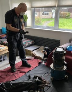 Being dog owners, this is always something that always makes me and Claire smile, a dog who loves our dust sheets! I believe that they think in their heads that we have come just see them, put out some nice bedding for them and make big fuss of them. This is Bell who lives in Meldreth, as can be seen she is a black Labrador and her favourite past time is to show you her toy, which I think was a monkey! There is nothing like a dog to put a smile on your face, loyal, great company and an integral part of any family home.